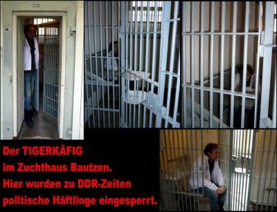 In der kommunistisch-verbrecherisch orientierten "DDR" wurden die resistenten politischen Häftlinge in den Zuchthäusern regelmäßig in den Tigerkäfig weggesperrt. Die Schinder nannten das im "DDR"-Jargon Arrest. Hier musste ich von meiner 3 1/2-jährigen Zuchthausstrafe 2,1 Jahre verbüßen. Viele kamen in den Zuchthäusern durch Totschlag und Selbstmord um. Viele erlitten auf Lebenszeit schwere psychische Störung oder sind eben nicht mehr unter uns.
